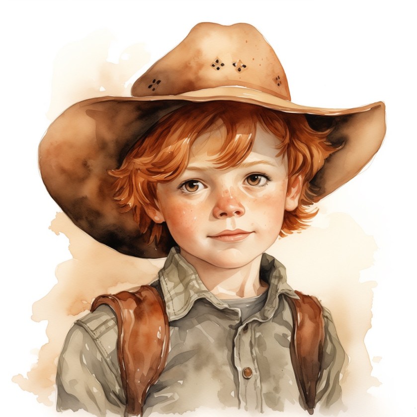 in the style of children’s book illustrations, ink and wash, a little boy with auburn hair and brown eyes and freckles in a cowboy hat and cowboy boots, whimsical children’s book illustrator –v 5.2 Job ID: 3c0be122-466a-4e8f-a784-1c15a387198f